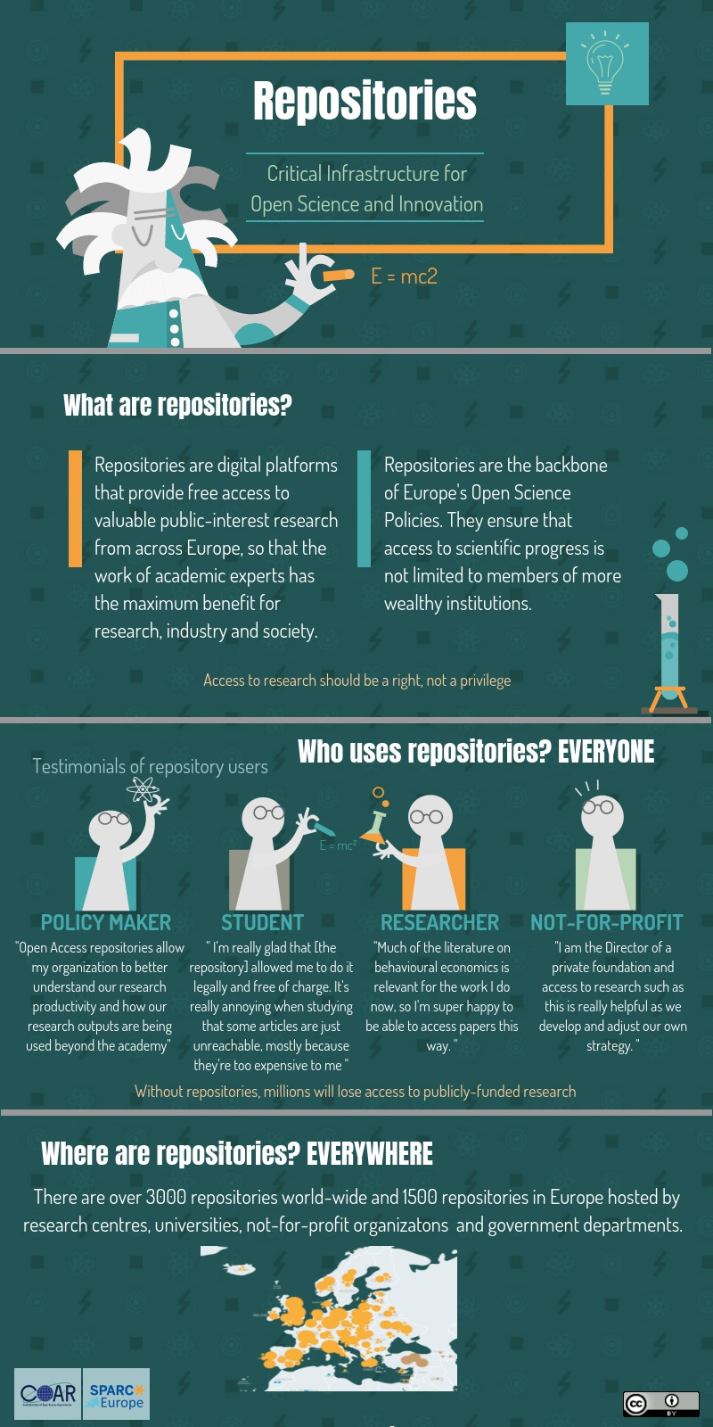 COAR (Confederation of Open Access Repositories) nos ilustra con esta infografía ¿Qué es un Repositorio? : Es una infraestructura esencial para la ciencia abierta y la innovación. [Fuente: COAR]
